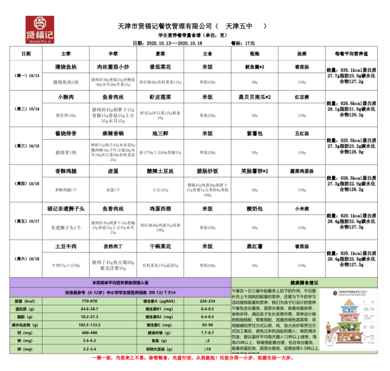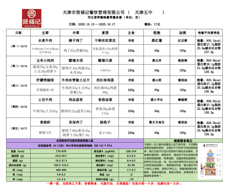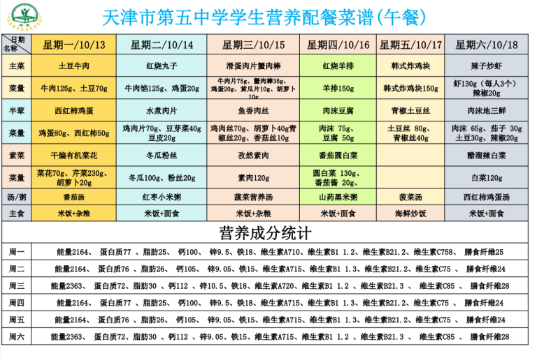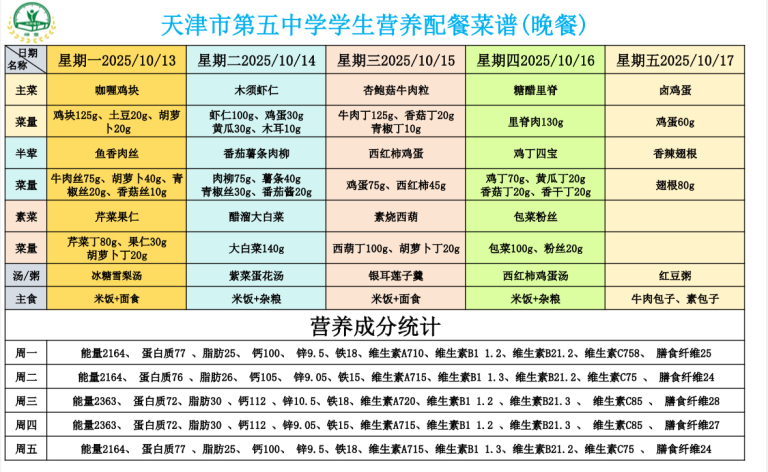 天津市第五中学学生营养餐(2025年10月13日-10月18日)