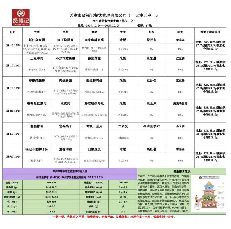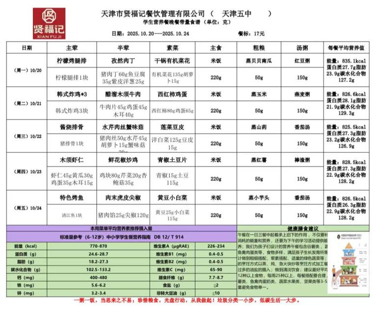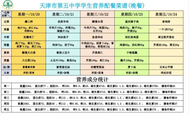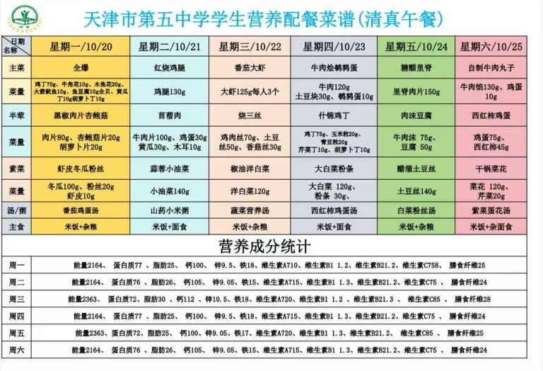 天津市第五中学学生营养餐(2025年10月20日-10月25日)