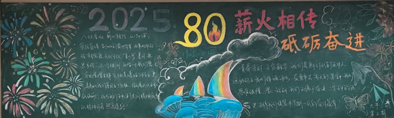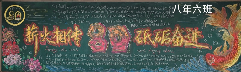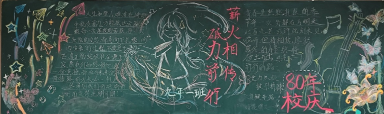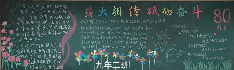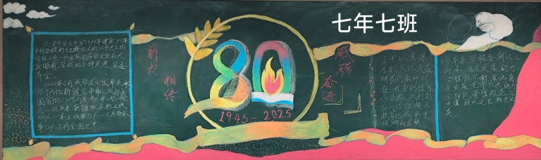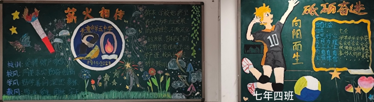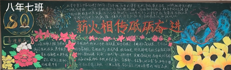 七年级板报色彩明快,巧妙绘制80周年标志,以纯真的笔触传递对学校的祝福。
