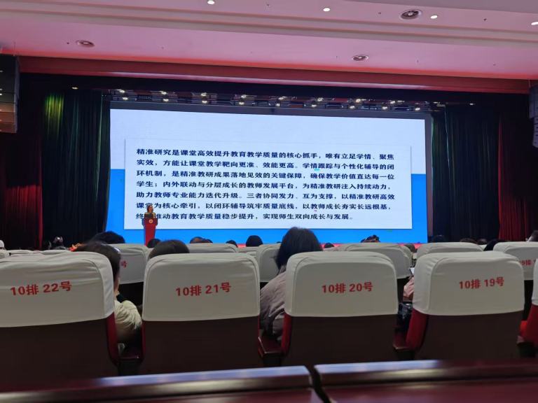 副校长刘惠以 “守正创新,筑牢教学质量生命线” 为主题,就教学工作提出具体要求。她讲到,教学是学校发展的核心工作,需聚焦提质增效、培优拔尖、考试研究和 AI 赋能四大重点方向。在课堂教学方面,她强调要优化 “163” 课堂教学要求,推行 “123” 课堂教学理念,强化学生的认知参与和行为参与,通过分层问题设计促进学生深度学习,以互动式教学提升课堂专注度。针对教学常规落实,她提出八项基本要求,涵盖教研聚焦方向、集备问题导向、课堂以终为始、作业分层反馈、指导因材施教、数据赋能阅卷、规范监考履职及教师专业深耕等方面,为教学提质增效划定“硬标尺”,推动课堂教学与教学管理的标准化、精细化发展。