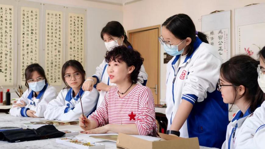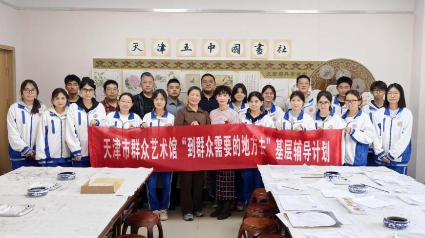 近日,天津市群众艺术馆联合红桥区文化馆走进天津市第五中学,开展“到群众需要的地方去”基层文艺团队辅导书画专场活动。天津市群众艺术馆副研究馆员朱珊、书法干部李悦,红桥区文化馆副馆长范鹏、书法干部黄可鑫,天津五中副校长张士举、宿管部副主任王健、美术组组长王蓉及高二年级新疆班学生代表共同参与,在墨香与童趣的交融中,开启了一场传统书画艺术的沉浸式体验之旅。