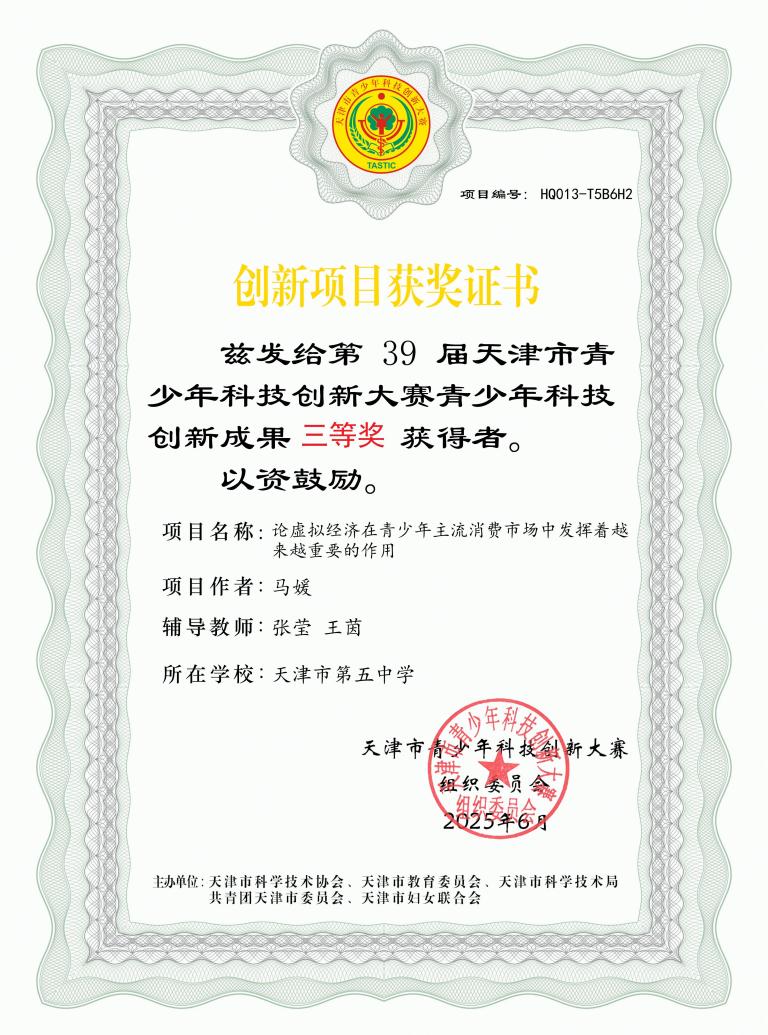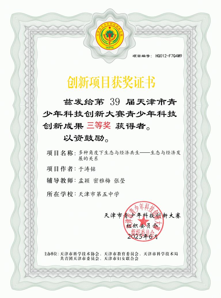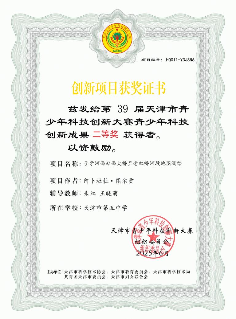 本次共获得6项重要奖项,涵盖国家级赛事天津赛区与市级赛事两大平台。国家级赛事(第十一届全国青年科普创新实验暨作品大赛天津赛区):一等奖1项、二等奖1项。市级赛事(第39届天津市青少年科技创新大赛):二等奖2项、三等奖2项。