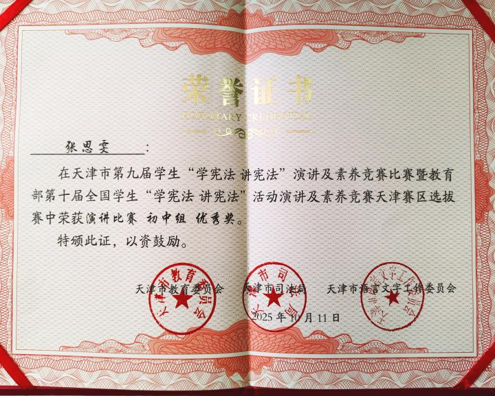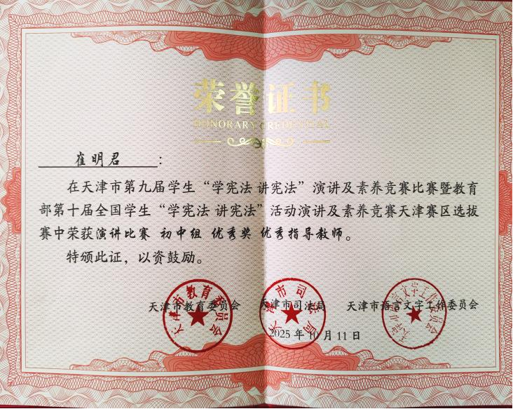 我校师生参加天津市第九届“学宪法 讲宪法”演讲比赛,通过班主任崔明君的悉心指导和学生的精心准备,最终在比赛中以优异的表现获得优秀奖。这次比赛充分的展现了我校师生对“学宪法 讲宪法”知识内容的积累与运用。