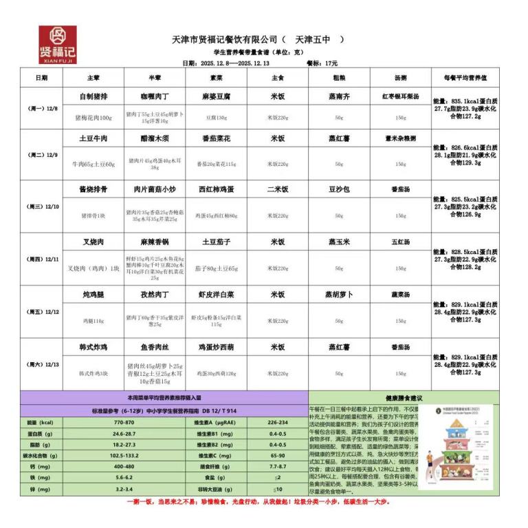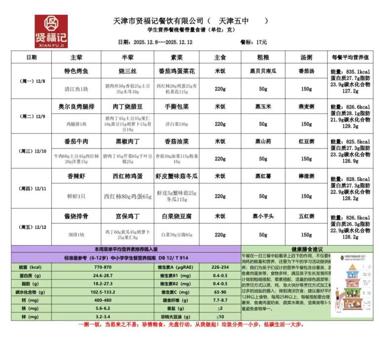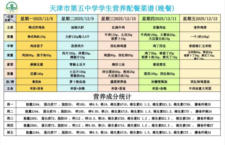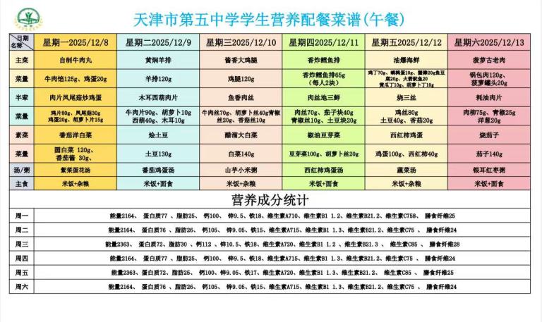 天津市第五中学学生营养餐(2025年12月08日-12月13日)