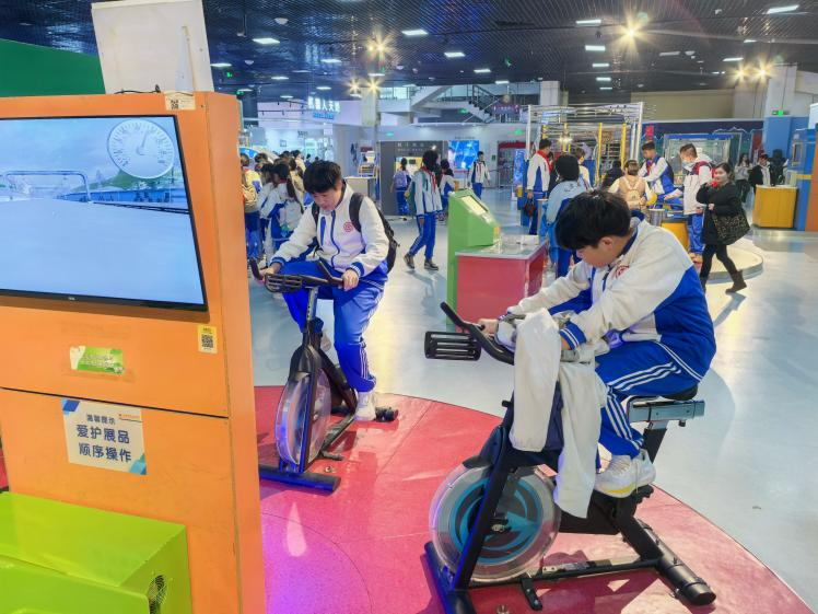 在科技馆讲解员的带领下,同学们分组参观了力学、电磁学、光学等主题展区。通过"电磁炮发射""光影迷宫""伯努利悬浮球"等互动装置,抽象的物理原理转化为直观的实验现象。炫酷的视觉效果引发阵阵惊叹,同学们争相提问、动手操作,"玩中学"深化了对知识的理解。一个个奇妙现象引得阵阵惊呼:“原来物理这么酷!”