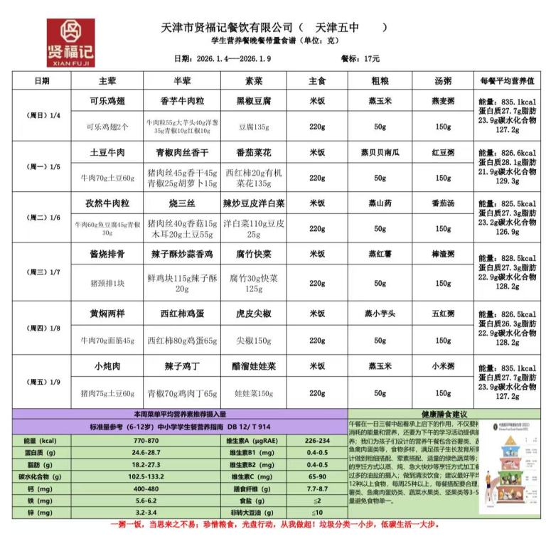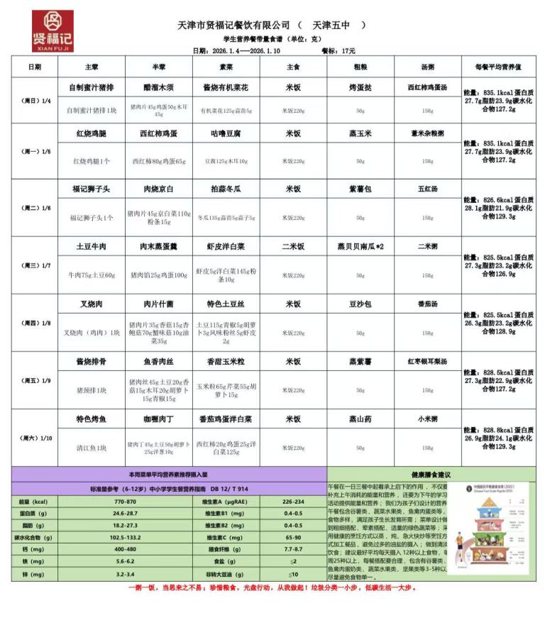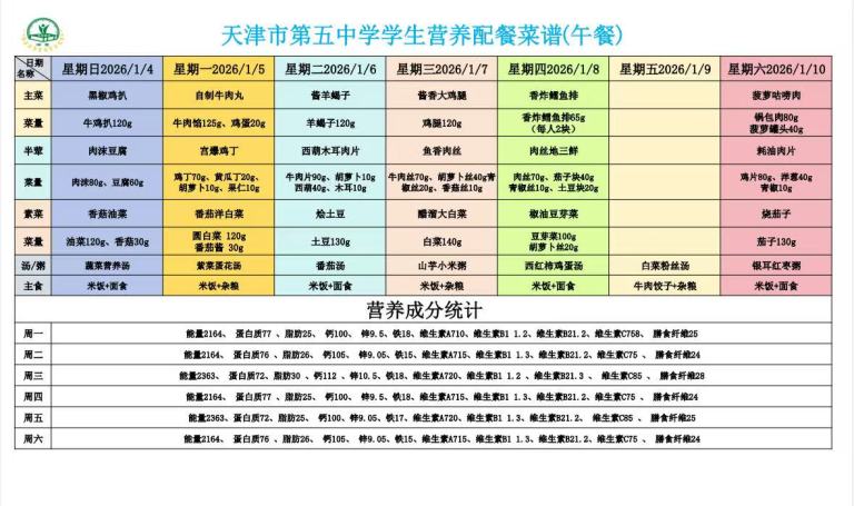天津市第五中学学生营养餐(2026年01月04日-01月10日)