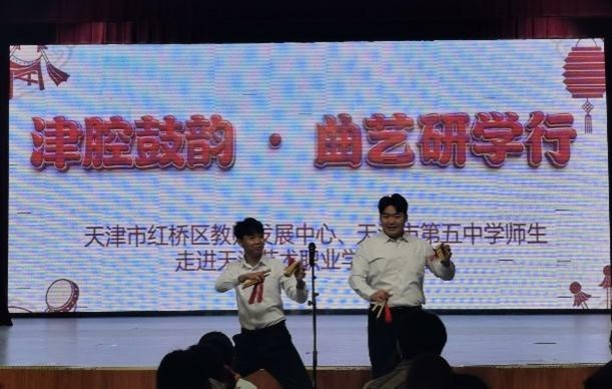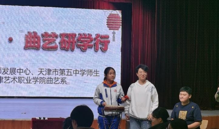 随后,曲艺学校的同学们为大家带来了精彩的表演。梅花大鼓的悠扬唱腔、京东大鼓的铿锵节奏、快板的清脆利落、相声的幽默风趣,轮番上演,赢得了五中师生的阵阵掌声。同学们被曲艺艺术的独特魅力深深吸引,笑声与掌声此起彼伏,久久不息。