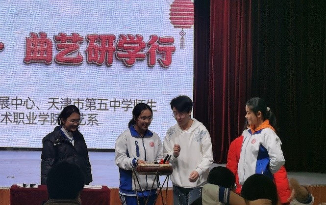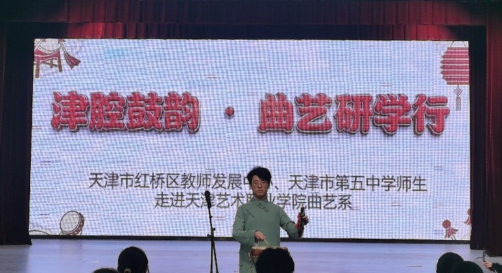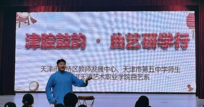 为弘扬中华优秀传统文化,让学生近距离感受曲艺艺术的独特魅力,近日,天津五中师生与教研员一行走进天津艺术职业学院(原天津北方曲艺学校),开启了一场别开生面的研学之旅。鼓曲作为我校音乐课程体系的重要组成部分,本次研学亦着眼于实地考察与沉浸体验,进一步丰富鼓曲教学资源、提升课堂高度,让课程“活”起来,让学生“动”起来,在名家与专业氛围中体悟津腔鼓韵的醇厚韵味。