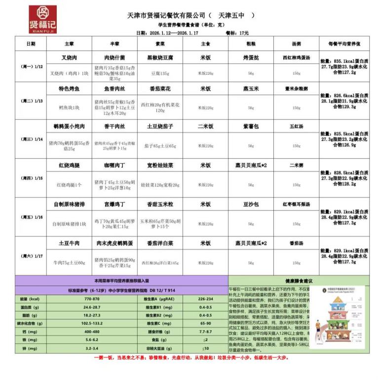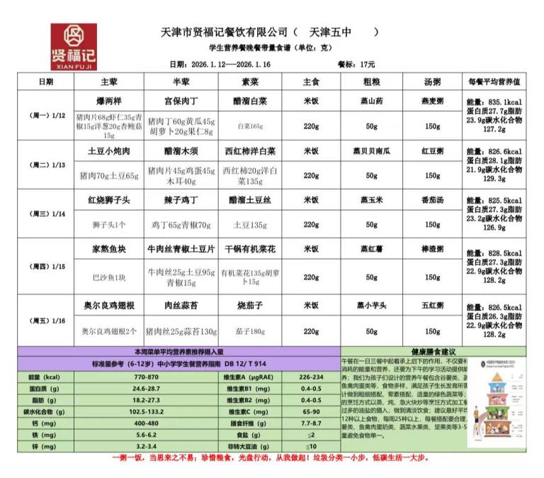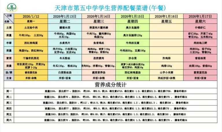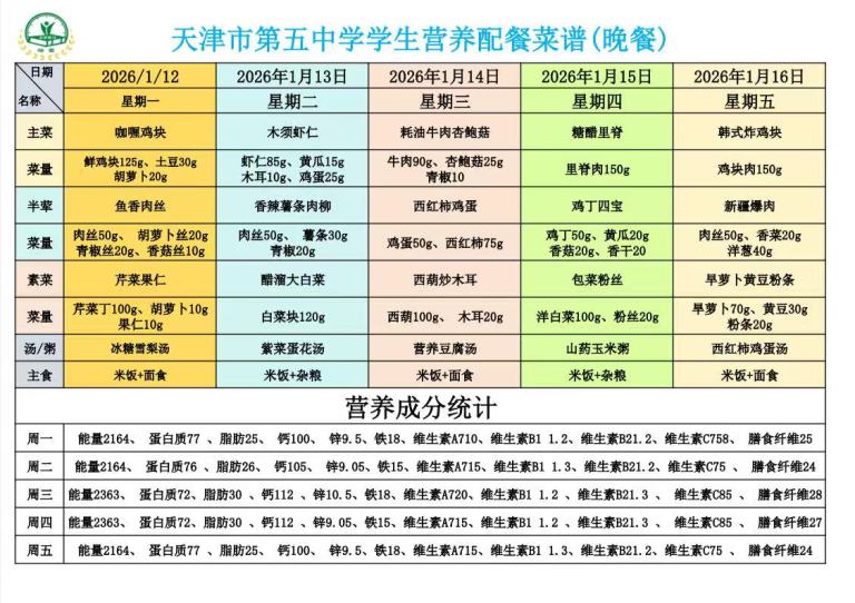天津市第五中学学生营养餐(2026年01月12日-01月17日)