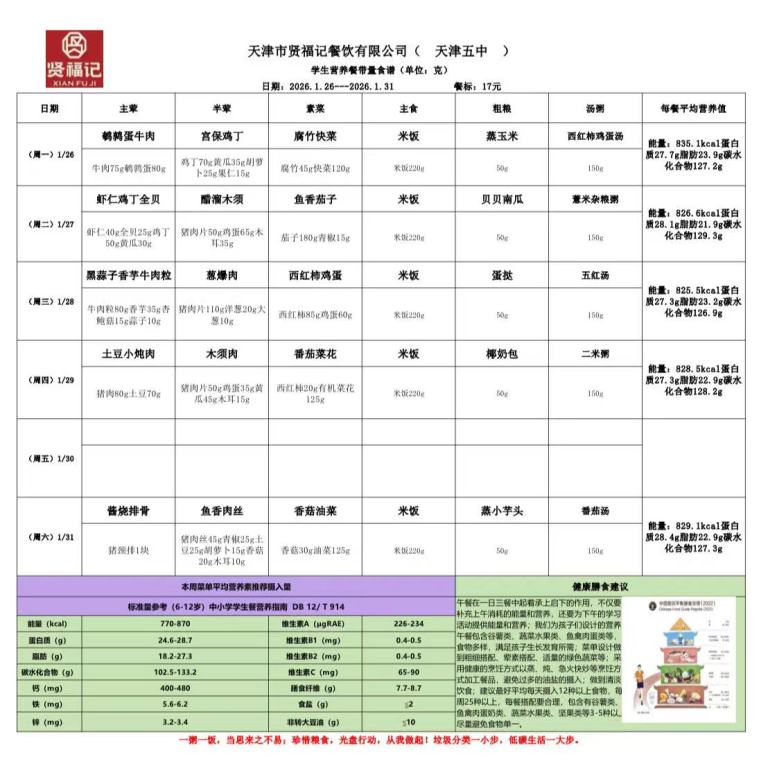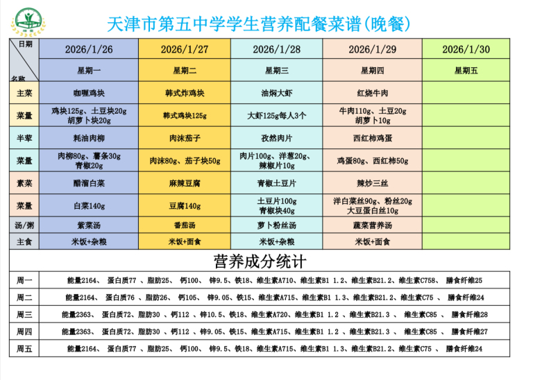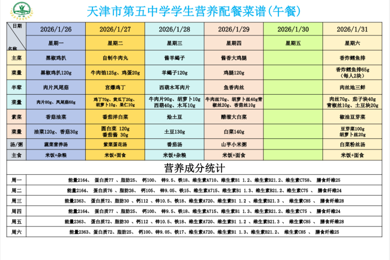 天津市第五中学学生营养餐(2026年01月26日-01月31日)