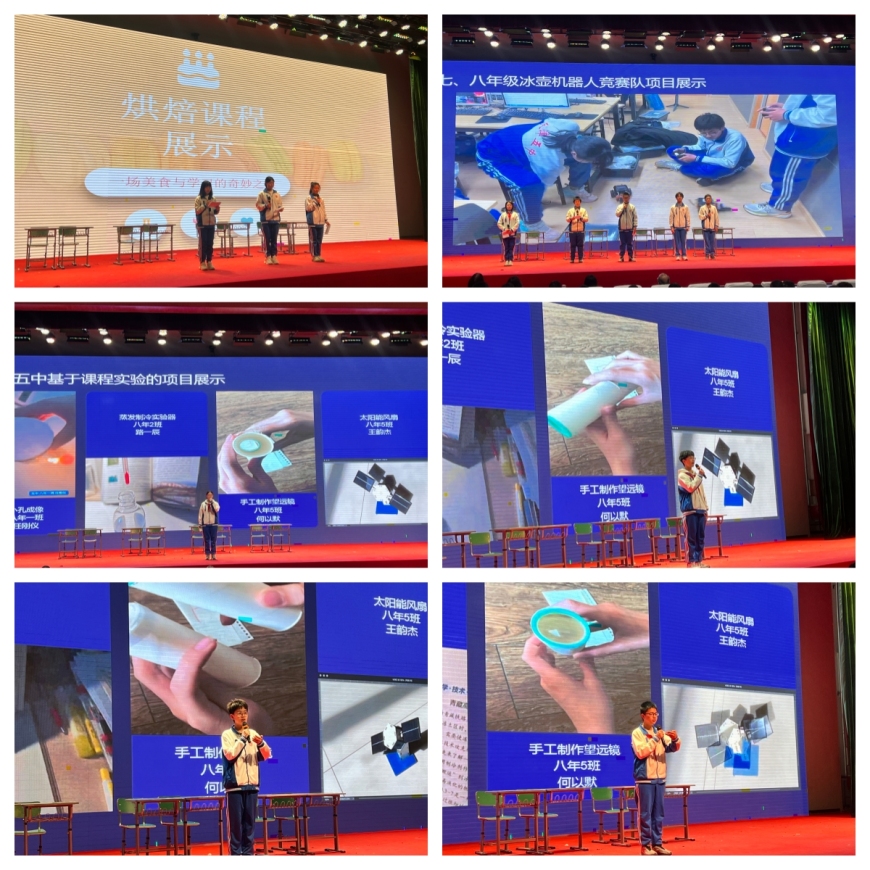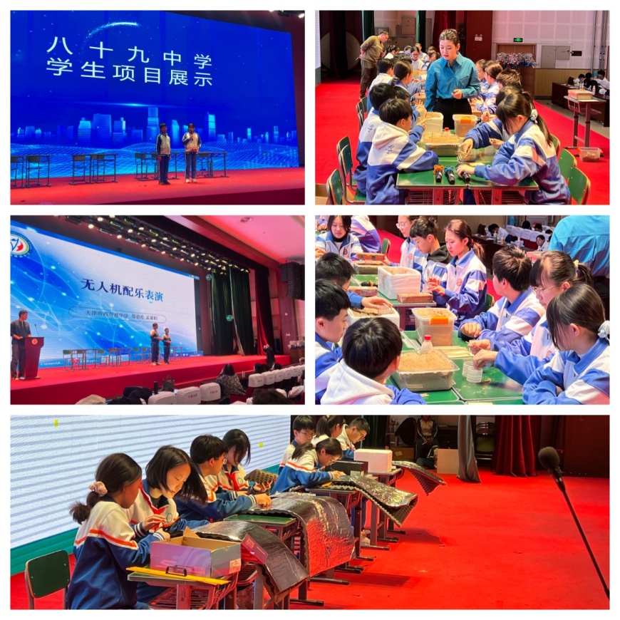 校长汇报结束后,各校特色科技展示依次登场。新华中学和苑学校带来科学与劳动跨学科展示课,聚焦“软土地基方案的探究与桥梁搭建”,展现理论与实践的融合;西青道中学呈现隔音房间模型制作与无人机配乐表演,兼具动手能力与观赏性;第八十九中学展示自制探月车项目,结合多学科知识,彰显学生航天探索热情与创新能力。天津五中展示了涵盖劳动与化学融合的“美食与学习的奇妙之旅”、编程冰壶机器人竞赛队展示,以及课程实验拓展创新项目,全方位展现科技教育的多元发展思路。