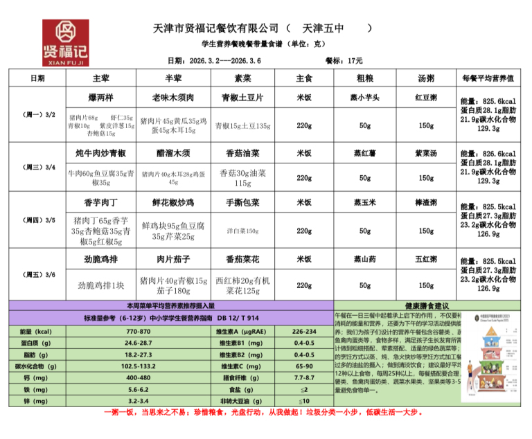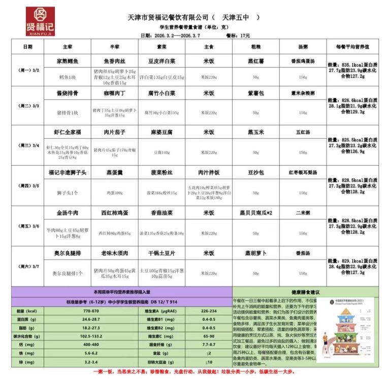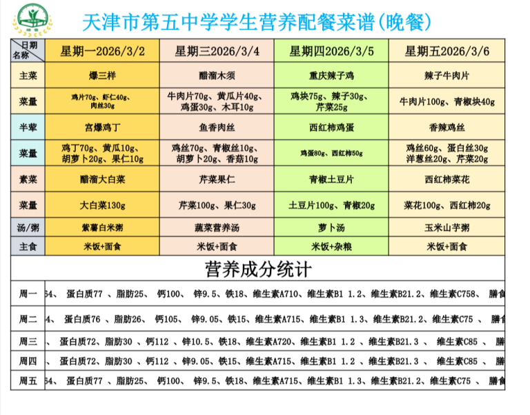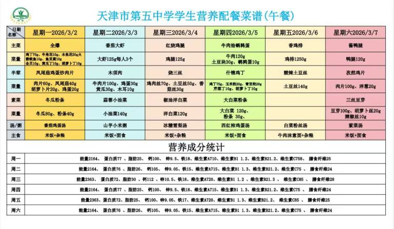 天津市第五中学学生营养餐(2026年03月02日-07日)