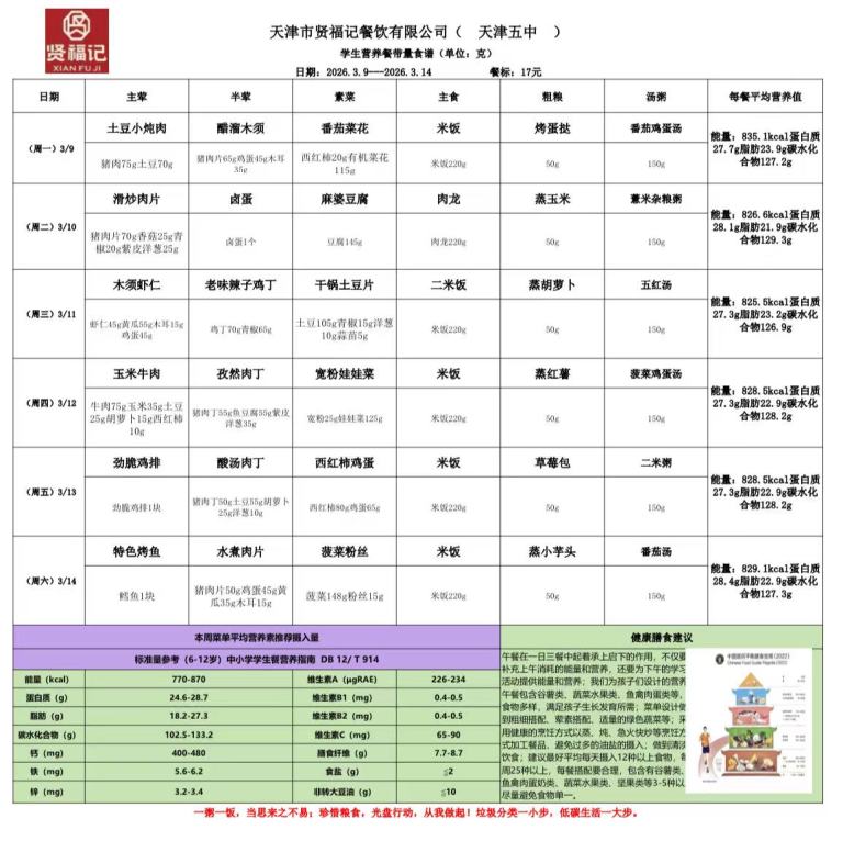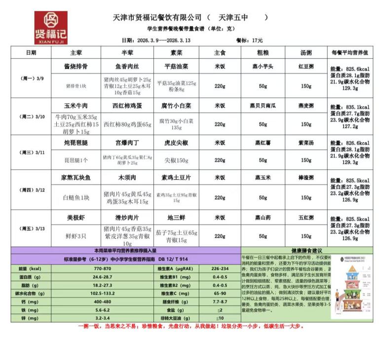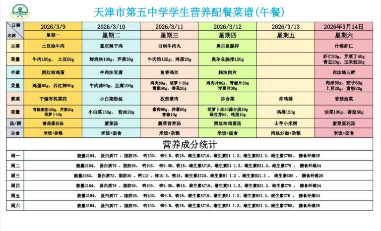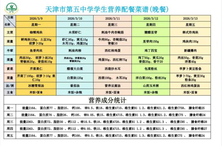 天津市第五中学学生营养餐(2026年03月09日-14日)