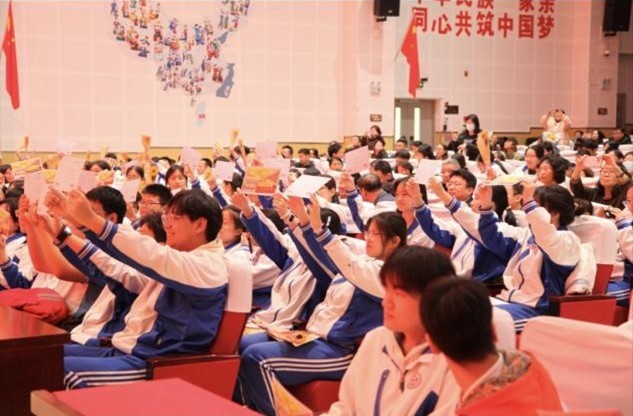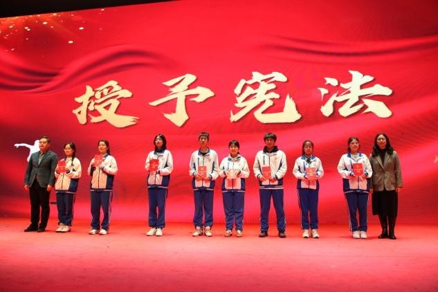 大会在庄严的国歌声中正式拉开帷幕。五星红旗冉冉升起,全体师生肃立注目,家国情怀在心中激荡。随后,学校党委书记郭文颖、校长王勇为高三学生代表颁发《中华人民共和国宪法》,以法治明责任,以宪法护成长,勉励同学们以成人之姿担时代使命,以法治之心赴青春征程。