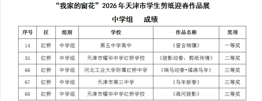 喜报传来,捷报频传!热烈祝贺我校高中学生在“我家的窗花”2026年天津市学生剪纸迎春作品展中,凭借作品《窗含瑞骥》斩获中学组一等奖,为校争光,彰显我校学子的青春风采与文化素养!